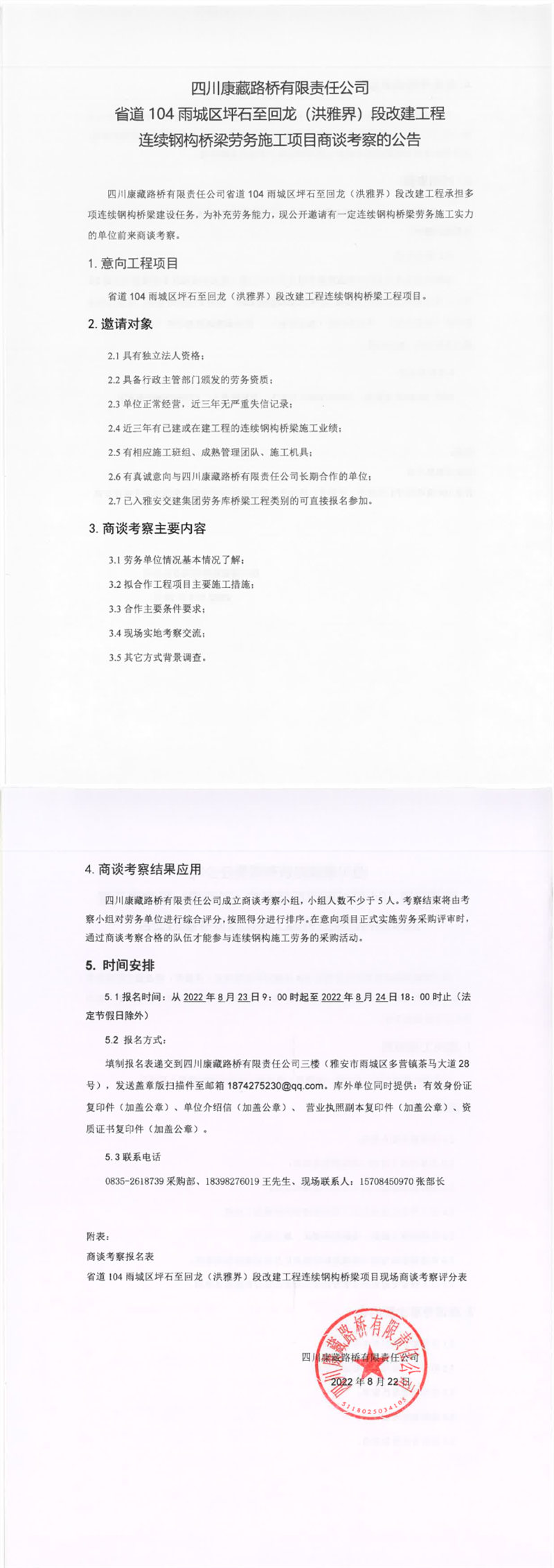 四川康藏路橋有限責任公司省道104雨城區(qū)坪石至回龍(洪雅界)段改建工程連續(xù)鋼構(gòu)橋梁勞務(wù)施工項目商談考察的公告