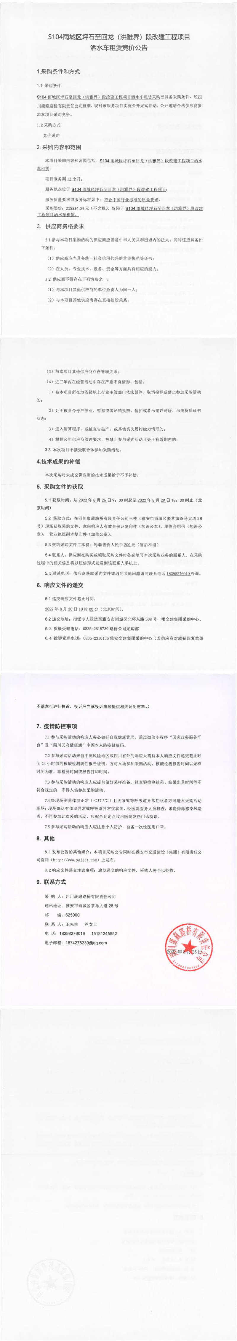 四川康藏路橋有限責任公司S104雨城區(qū)坪石至回龍(洪雅界)段改建工程項目灑水車租賃競價公告
