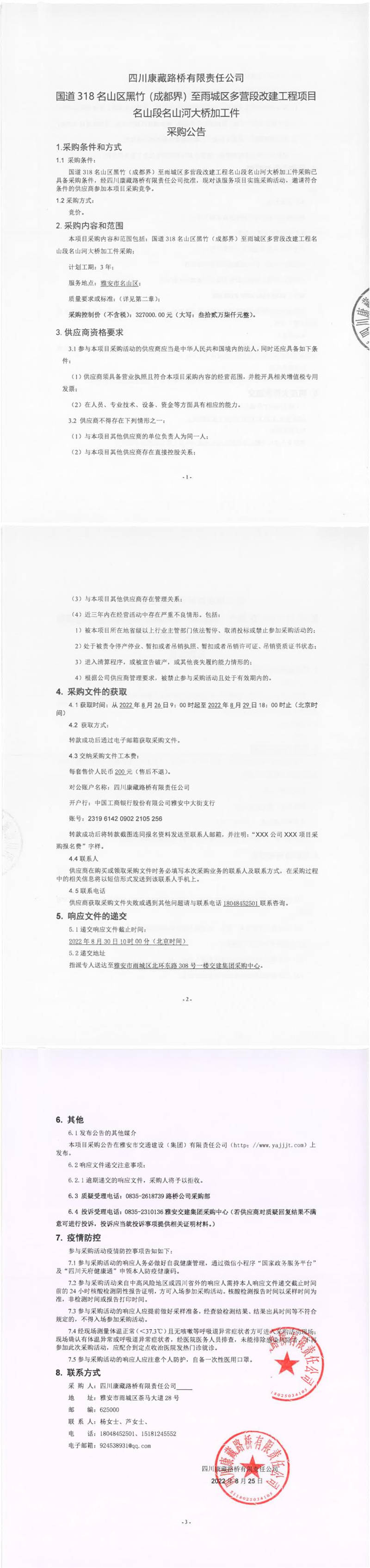 四川康藏路橋有限責任公司國道318名山區(qū)黑竹(成都界)至雨城區(qū)多營段改建工程項目名山段名山河大橋加工件采購公告