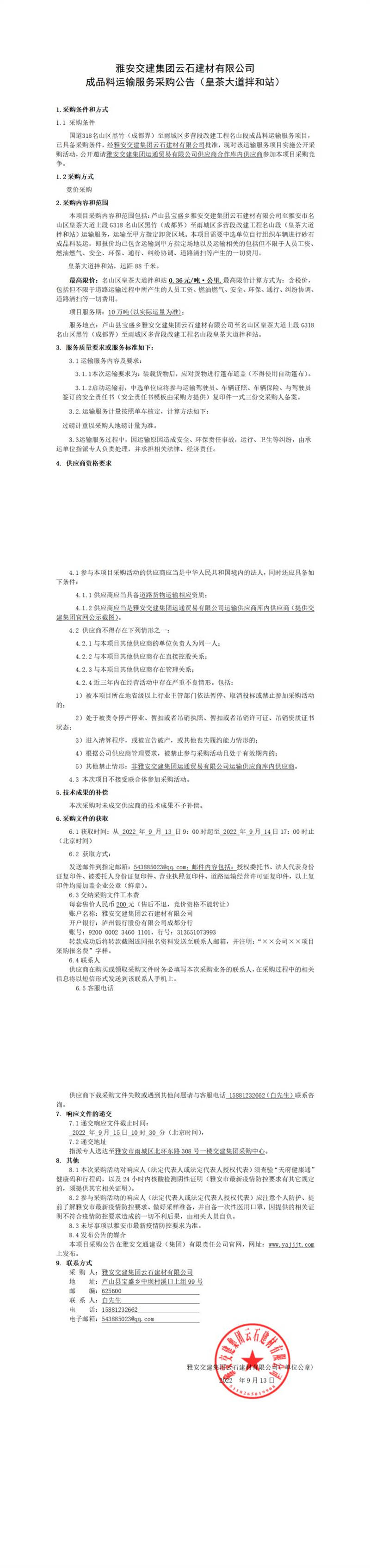 雅安交建集團(tuán)云石建材有限公司成品料運(yùn)輸服務(wù)采購(gòu)公告(皇茶大道拌和站)