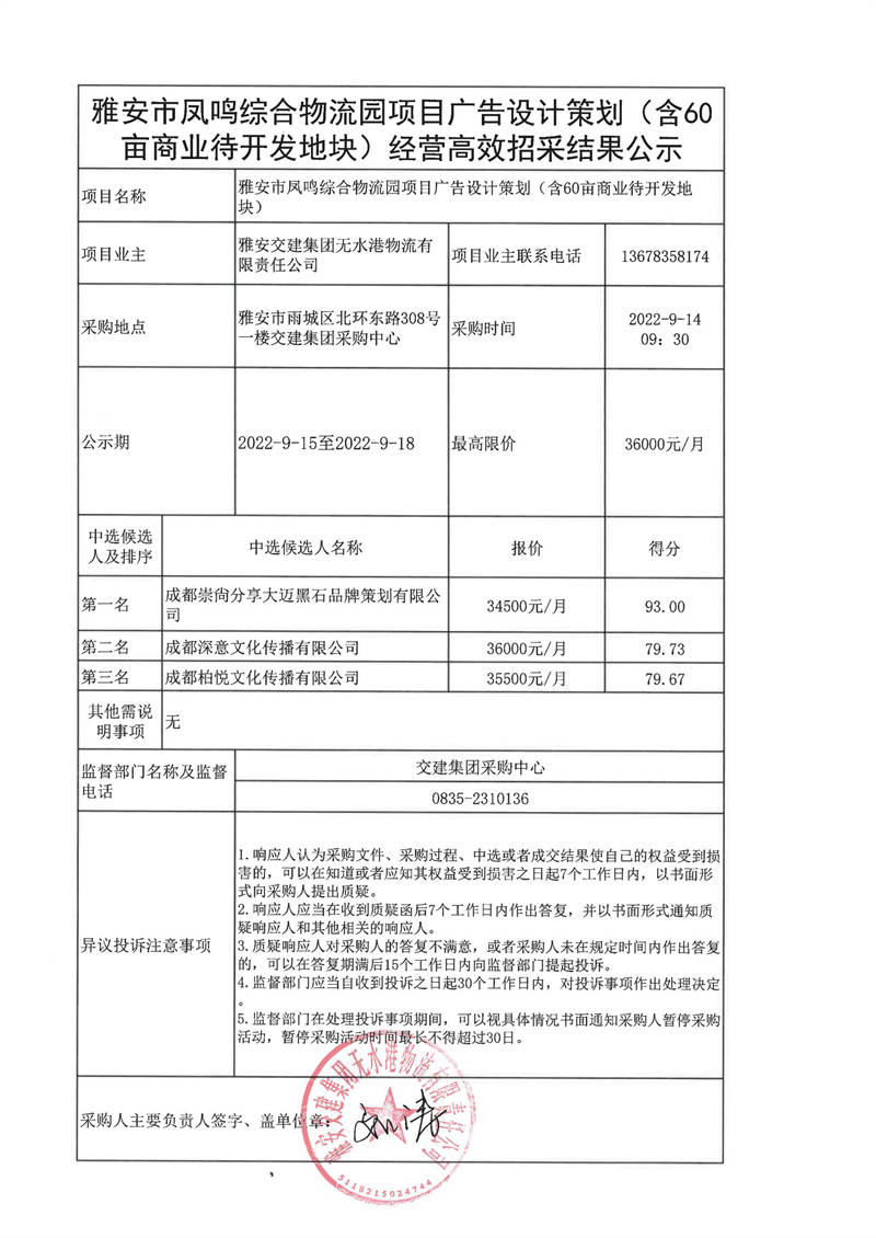 雅安交建集團無水港物流有限責任公司雅安市鳳鳴綜合物流園項目廣告設計策劃(含60畝商業(yè)待開發(fā)地塊)經營高效招采結果公示