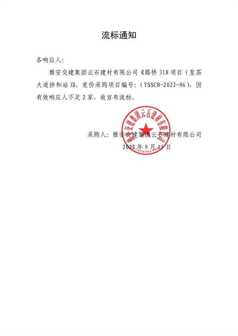 雅安交建集團云石建材有限公司成品料運輸服務(wù)采購(皇茶大道拌和站)流標(biāo)通知