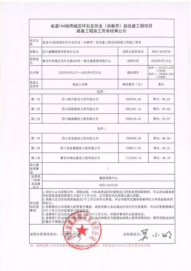 四川康藏路橋有限責(zé)任公司省道104線雨城區(qū)坪石至回龍(洪雅界)段改建工程項目路基工程施工勞務(wù)結(jié)果公示