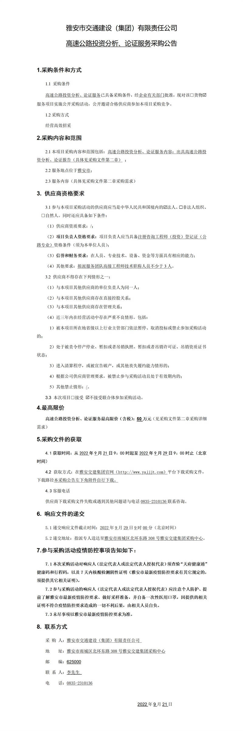 雅安市交通建設(shè)(集團)有限責任公司高速公路投資分析、論證服務采購公告