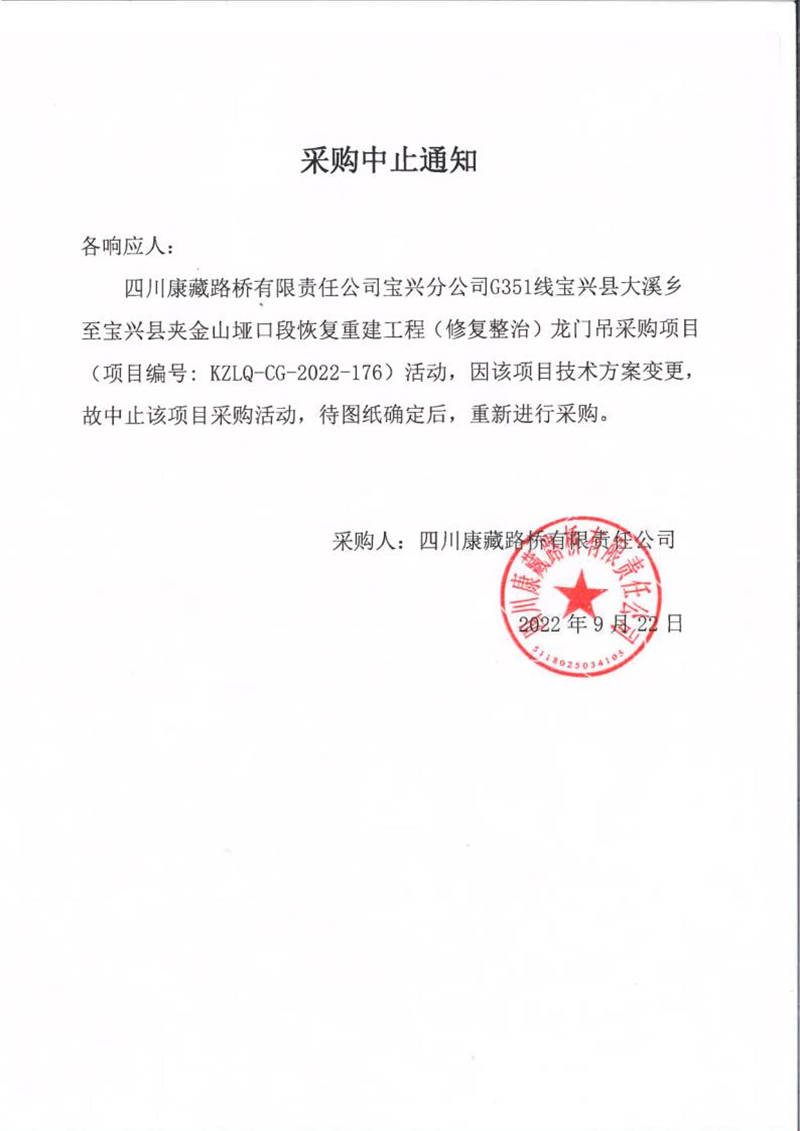 四川康藏路橋有限責(zé)任公司寶興分公司G351線(xiàn)寶興縣大溪鄉(xiāng)至寶興縣夾金山埡口段恢復(fù)重建工程(修復(fù)整治)龍門(mén)吊采購(gòu)中止通知