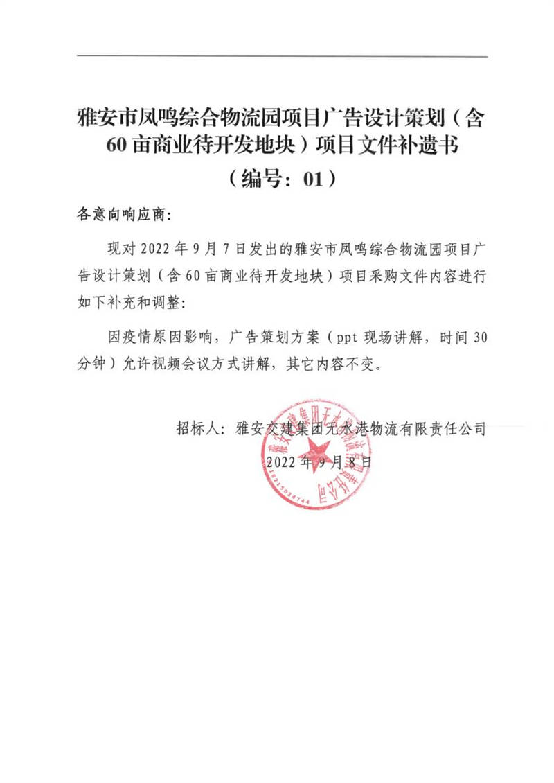 雅安交建集團無水港物流有限責任公司雅安市鳳鳴綜合物流園項目廣告設計策劃(含60畝商業(yè)待開發(fā)地塊)項目文件補遺書(編號:01)