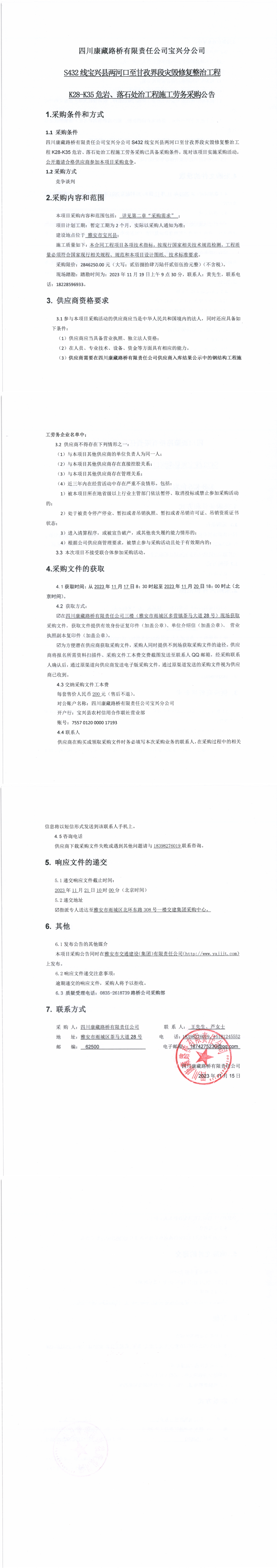 四川康藏路橋有限責(zé)任公司寶興分公司S432線寶興縣兩河口至甘孜界段災(zāi)毀修復(fù)整治工程K28-K35危巖、落石處治工程施工勞務(wù)采購(gòu)公告