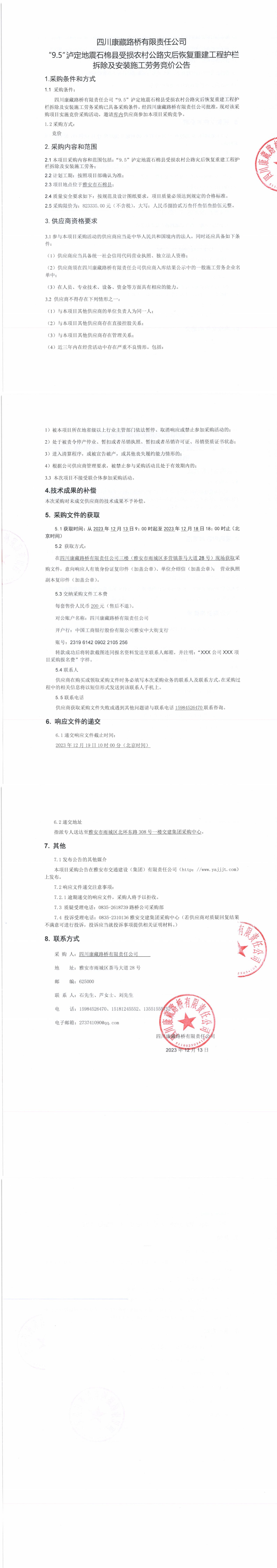 四川康藏路橋有限責(zé)任公司“9.5”瀘定地震石棉縣受損農(nóng)村公路災(zāi)后恢復(fù)重建工程護(hù)欄拆除及安裝施工勞務(wù)競價(jià)公告