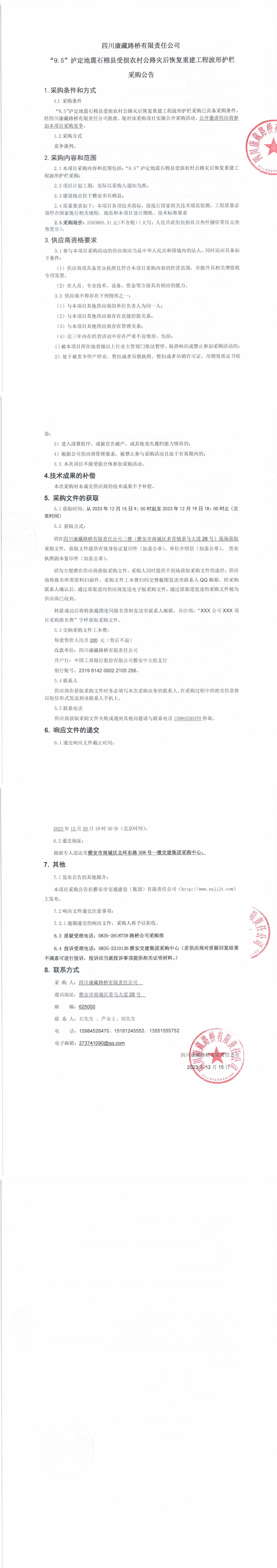 四川康藏路橋有限責(zé)任公司“9.5”瀘定地震石棉縣受損農(nóng)村公路災(zāi)后恢復(fù)重建工程波形護欄采購公告