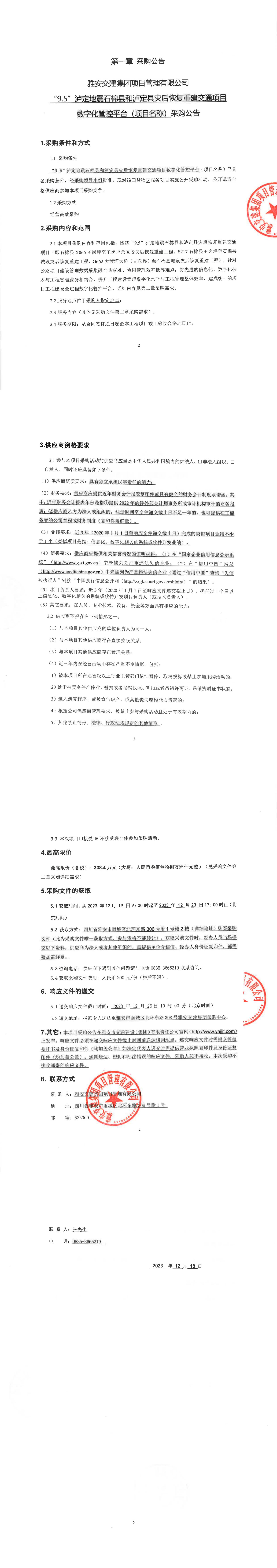 雅安交建集團(tuán)項目管理有限公司“9.5”瀘定地震石棉縣和瀘定縣災(zāi)后恢復(fù)重建交通項目數(shù)字化管控平臺(項目名稱)采購公告