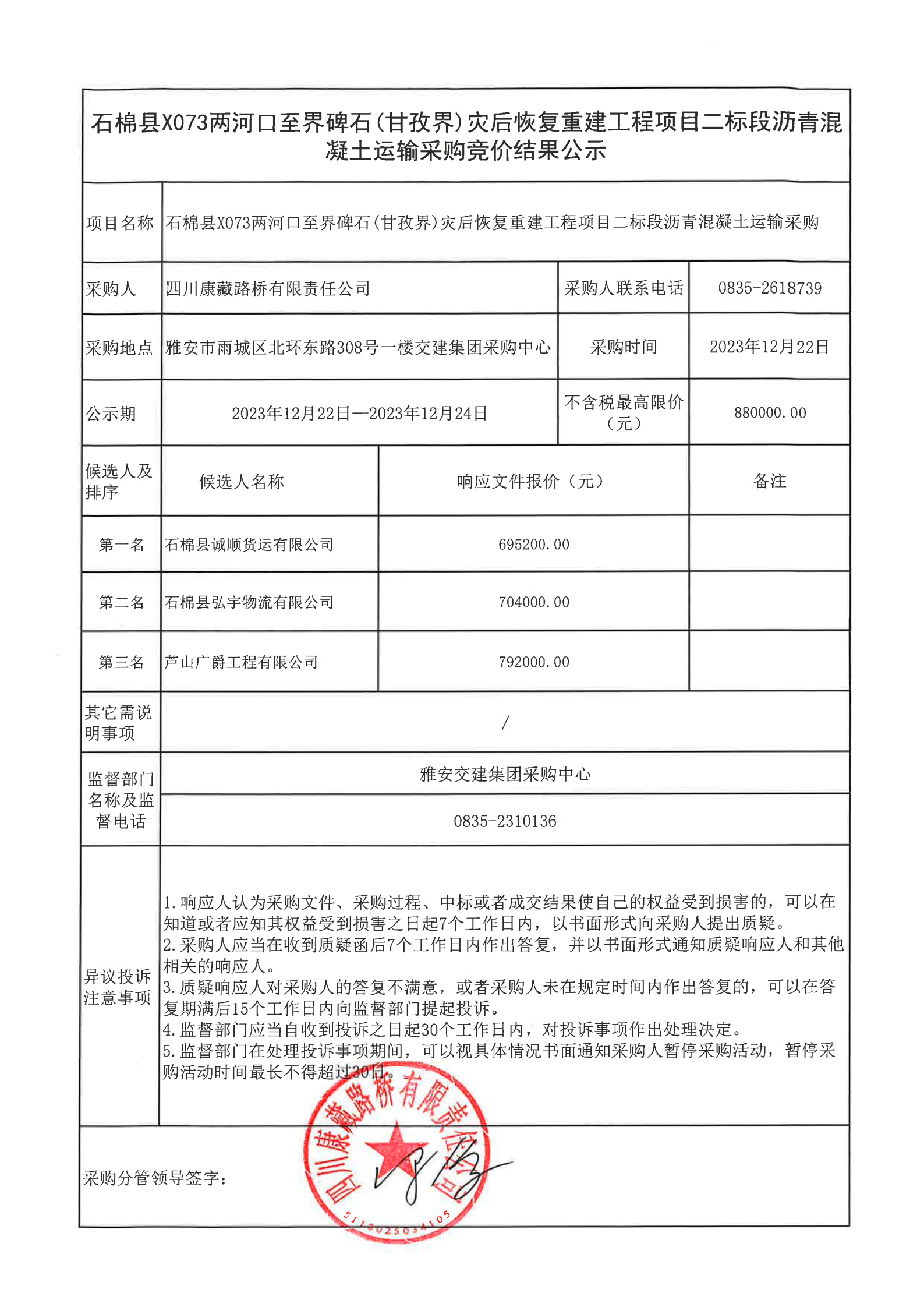 四川康藏路橋有限責(zé)任公司石棉縣 X073 兩河口至界碑石(甘孜界)災(zāi)后恢復(fù)重建工程項(xiàng)目二標(biāo)段瀝青混凝土運(yùn)輸采購(gòu)競(jìng)價(jià)結(jié)果公示