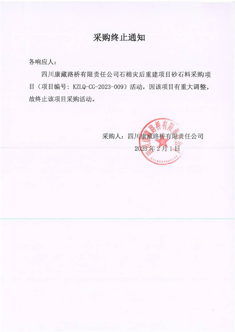 四川康藏路橋有限責(zé)任公司石棉災(zāi)后重建項(xiàng)目砂石料采購項(xiàng)目采購終止通知