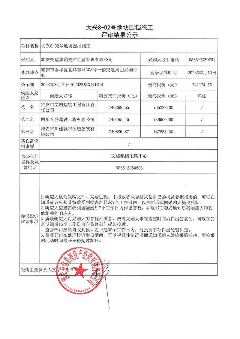 雅安交建集團資產(chǎn)經(jīng)營管理有限公司大興8-02號地塊圍擋施工結(jié)果公示