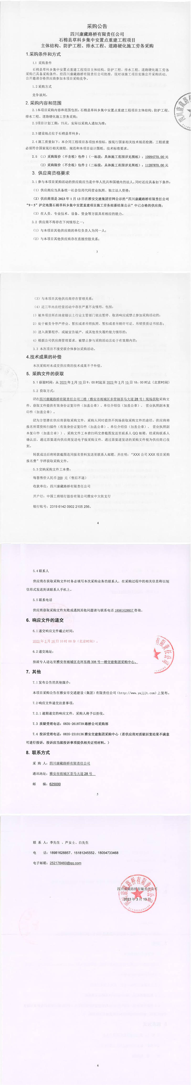 四川康藏路橋有限責(zé)任公司石棉縣草科鄉(xiāng)集中安置點重建工程項目主體結(jié)構(gòu)、防護工程、排水工程、道路硬化施工采購公告