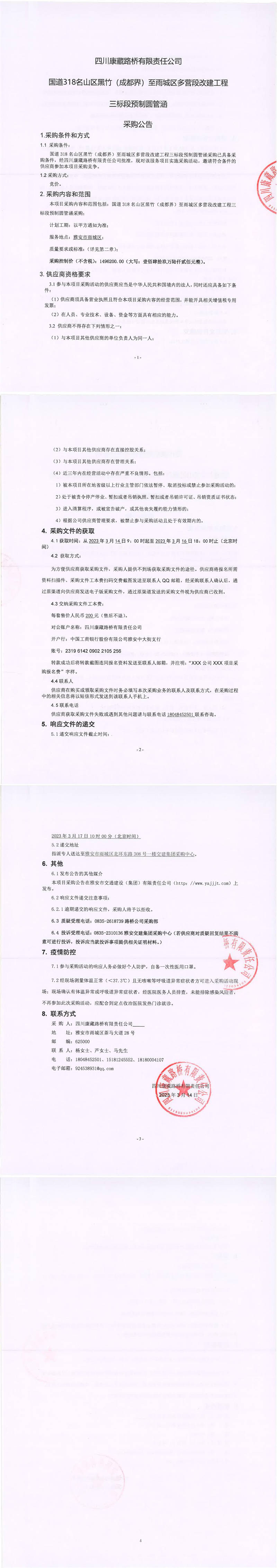 四川康藏路橋有限責(zé)任公司國道318名山區(qū)黑竹(成都界)至雨城區(qū)多營段改建工程三標段預(yù)制圓管涵采購公告