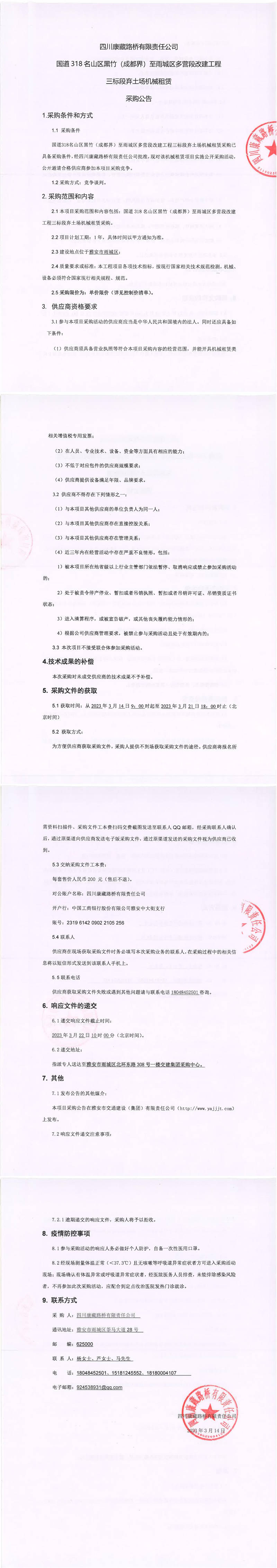 四川康藏路橋有限責任公司國道318名山區(qū)黑竹(成都界)至雨城區(qū)多營段改建工程三標段棄土場機械租賃采購公告