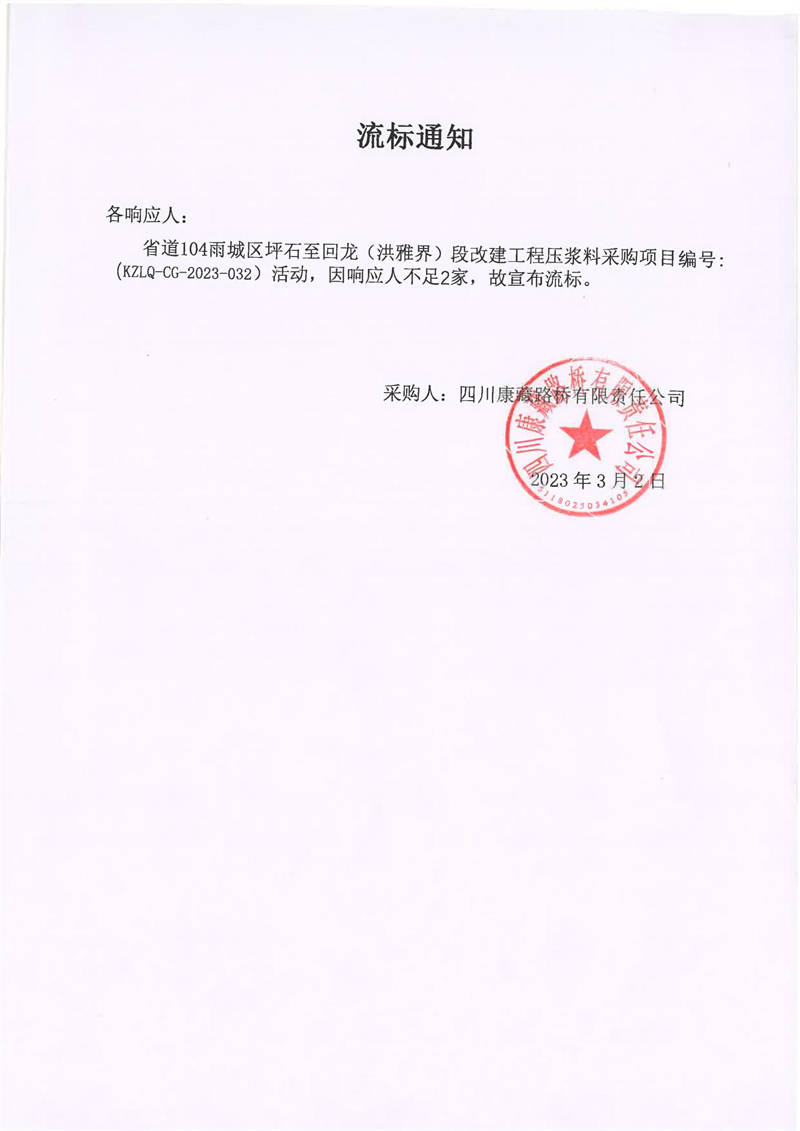 四川康藏路橋有限責(zé)任公司省道104雨城區(qū)坪石至回龍(洪雅界)段改建工程壓漿料采購流標(biāo)通知