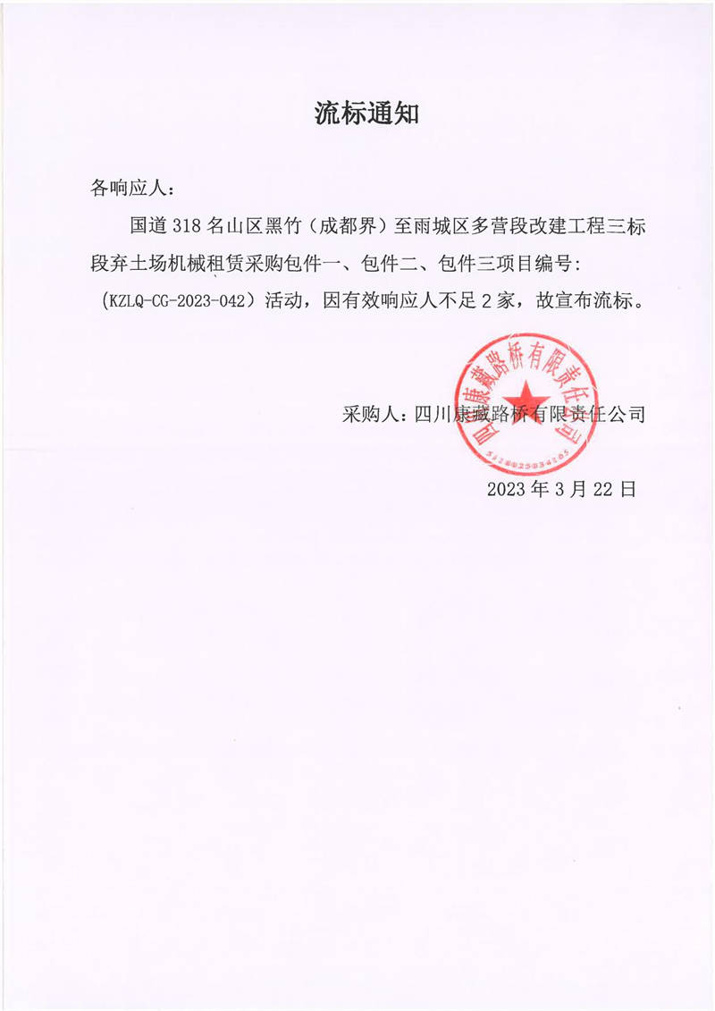 四川康藏路橋有限責(zé)任公司國(guó)道318名山區(qū)黑竹(成都界)至雨城區(qū)多營(yíng)段改建工程三標(biāo)段棄土場(chǎng)機(jī)械租賃采購流標(biāo)通知