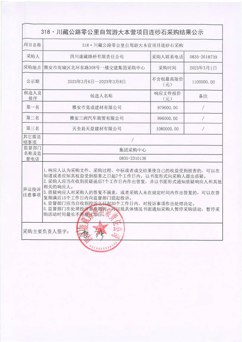 四川康藏路橋有限責(zé)任公司國道318名山區(qū)黑竹(成都界)至雨城區(qū)多營段改建工程物資采購(包件1)結(jié)果公示