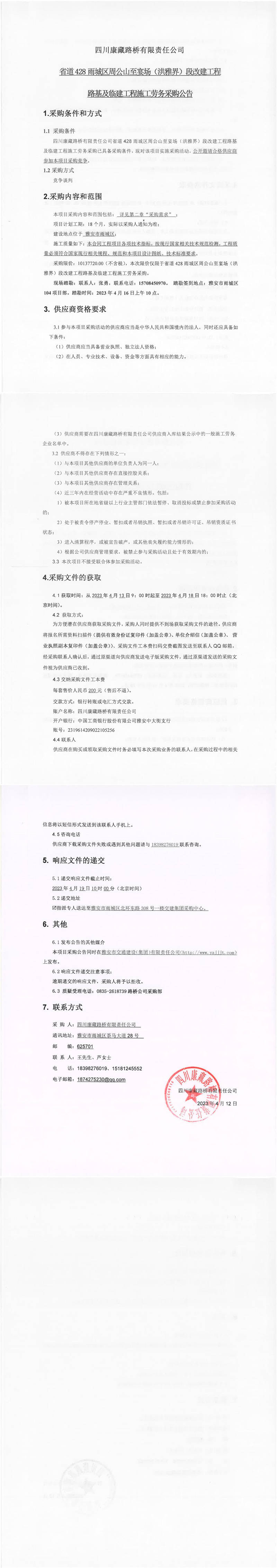 四川康藏路橋有限責任公司省道428雨城區(qū)周公山至宴場(洪雅界)段改建工程路基及臨建工程施工勞務(wù)采購公告