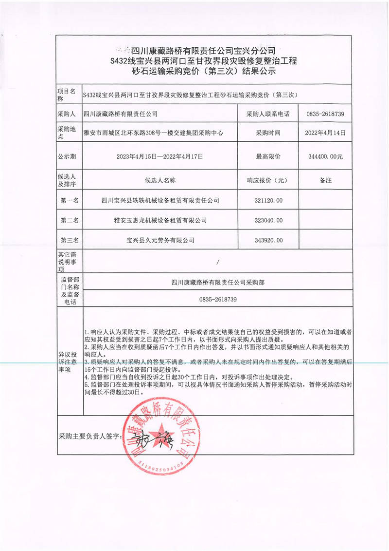四川康藏路橋有限責任公司寶興分公司S432線寶興縣兩河口至甘孜界段災(zāi)毀修復(fù)整治工程砂石運輸采購競價(第三次)結(jié)果公示