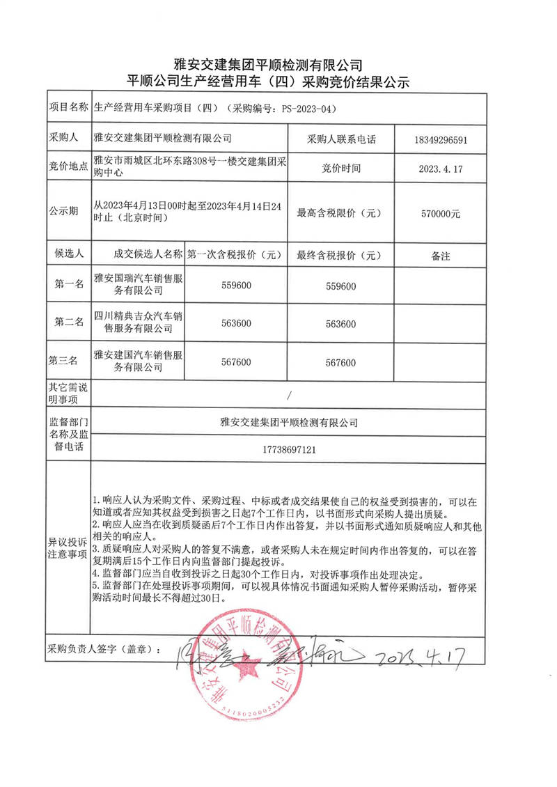 雅安交建集團(tuán)平順檢測(cè)有限公司平順公司生產(chǎn)經(jīng)營(yíng)用車(四)采購競(jìng)價(jià)結(jié)果公示