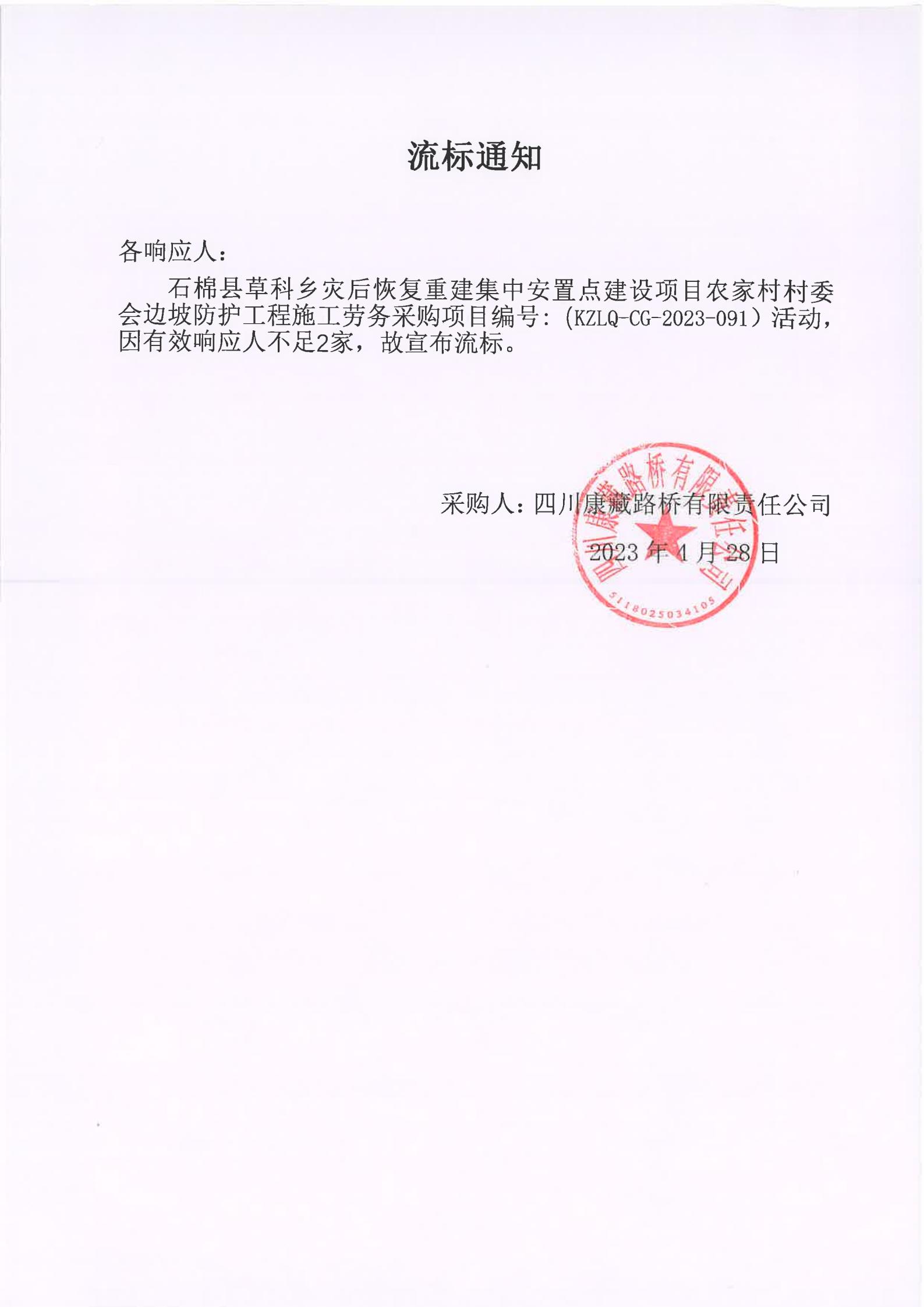 四川康藏路橋有限責(zé)任公司石棉草科鄉(xiāng)災(zāi)后恢復(fù)重建集中安置點建設(shè)項目農(nóng)家村村委會邊坡防護工程施工勞務(wù)流標(biāo)通知