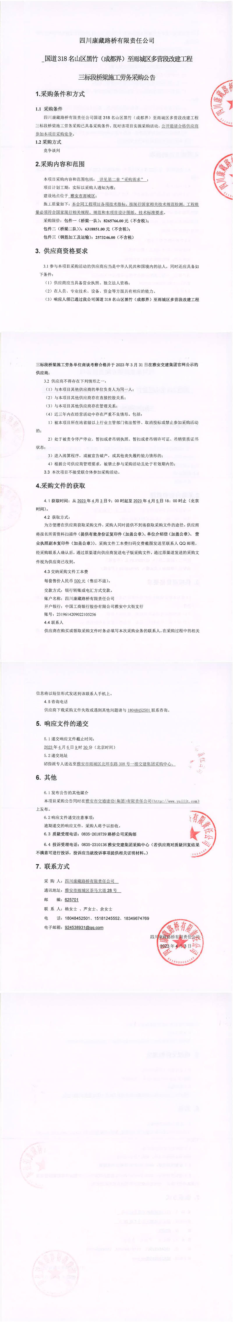 四川康藏路橋有限責(zé)任公司國道318名山區(qū)黑竹(成都界)至雨城區(qū)多營段改建工程三標(biāo)段橋梁施工勞務(wù)采購公告