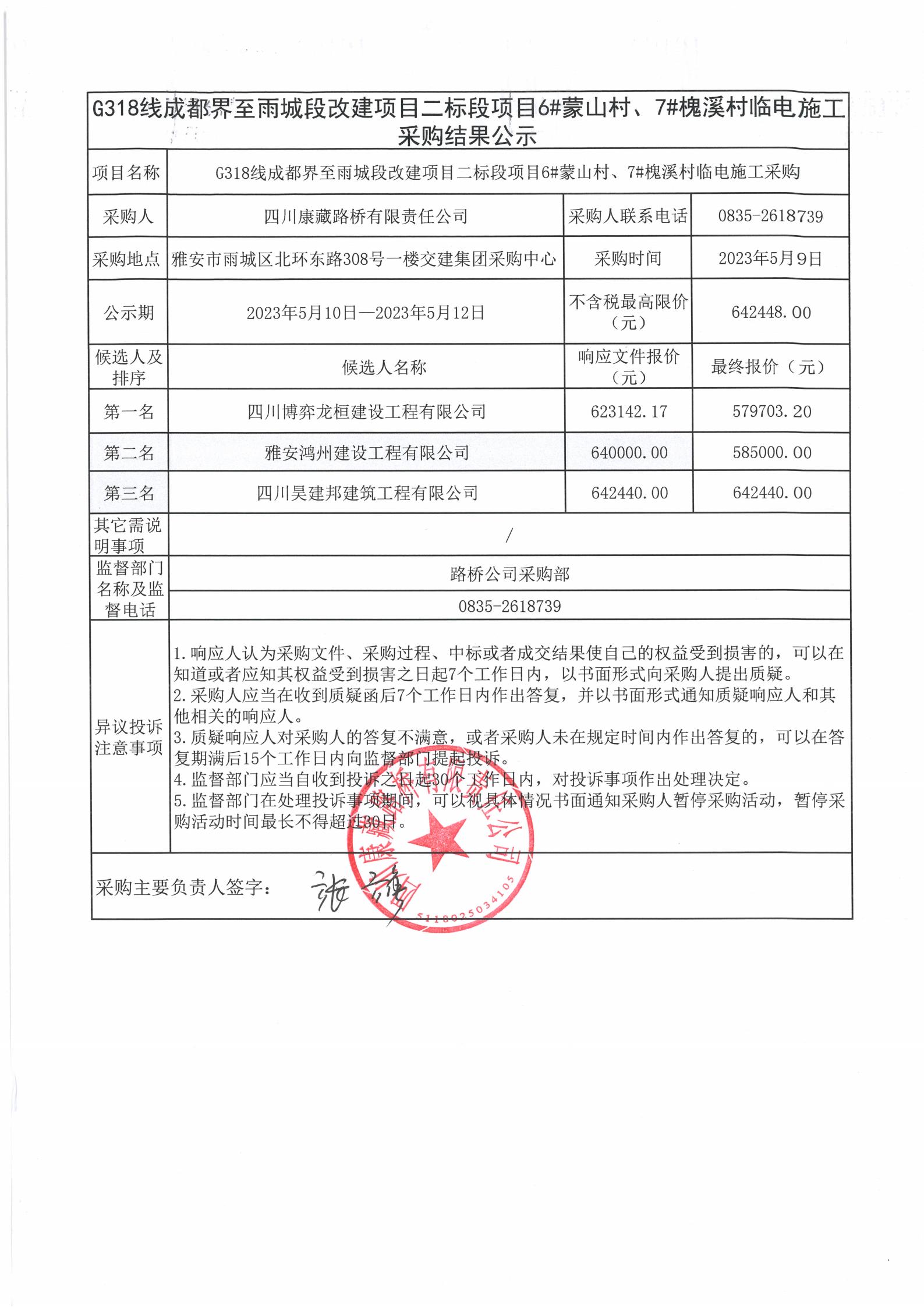 四川康藏路橋有限責任公司G318線成都至雨城段改建項目二標段項目6#蒙山村、7#槐溪村臨時電施工采購結果公示