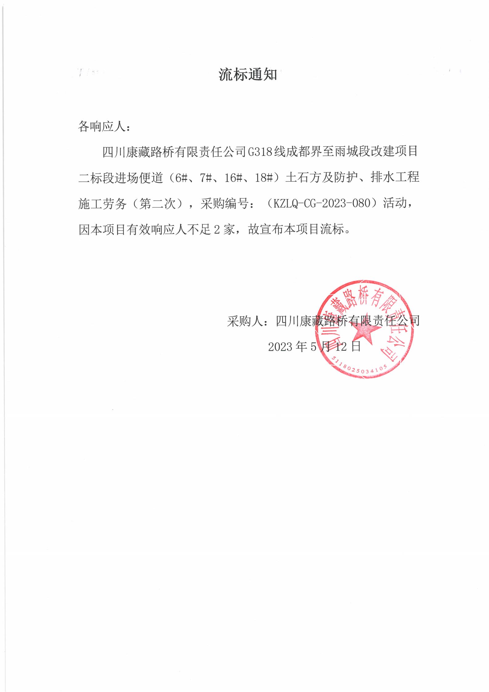 四川康藏路橋有限責(zé)任公司G318線成都至雨城段改建項目二標(biāo)段進(jìn)場便道(6#、7#、16#、18#)土石方及防護、排水工程施工勞務(wù)(第二次)流標(biāo)通知