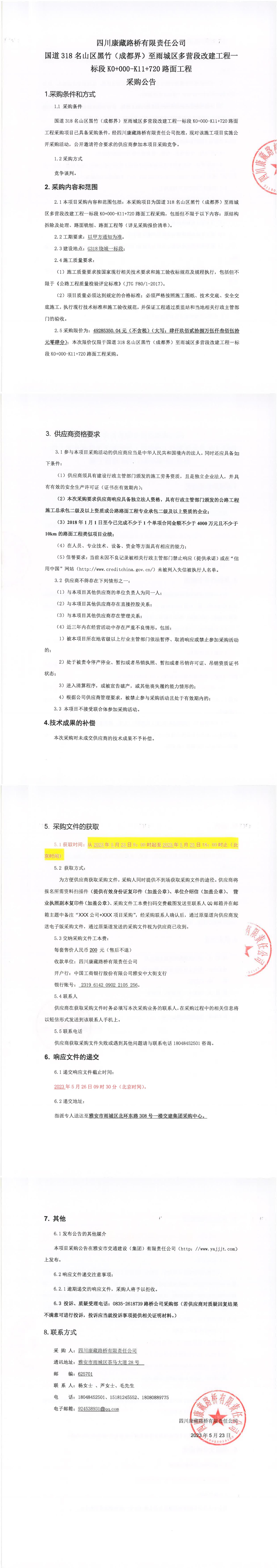 四川康藏路橋有限責(zé)任公司國道318名山區(qū)黑竹(成都界)至雨城區(qū)多營段改建工程一標段K0+000-K11+720路面工程采購公告
