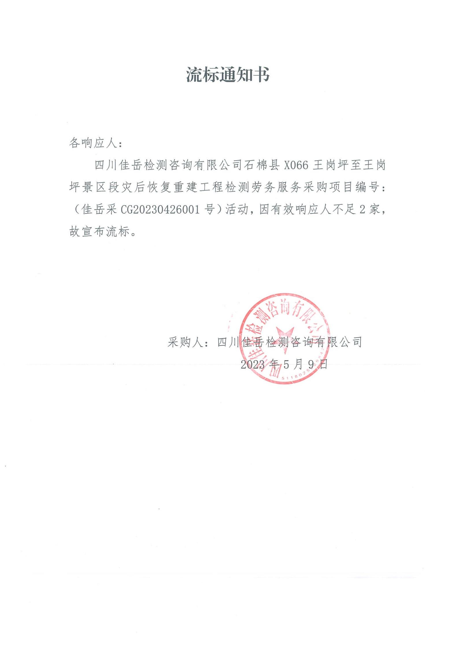 四川佳岳檢測咨詢有限公司石棉縣X066王崗坪至王崗坪景區(qū)段災(zāi)后恢復重建工程檢測勞務(wù)服務(wù)流標通知