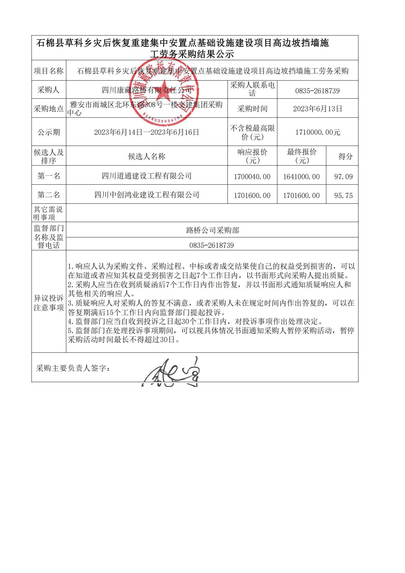 四川康藏路橋有限責任公司石棉縣草科鄉(xiāng)災后恢復重建集中安置點基礎(chǔ)設施建設項目高邊坡?lián)鯄κ┕趧詹少徑Y(jié)果公示