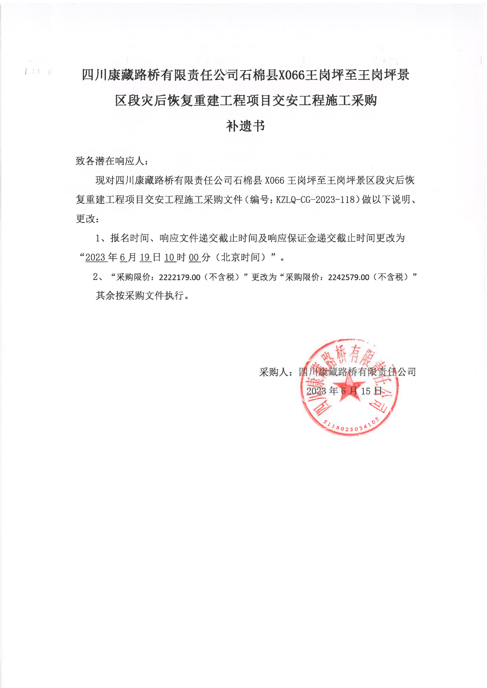 四川康藏路橋有限責(zé)任公司石棉縣X066王崗坪至王崗坪景區(qū)段災(zāi)后恢復(fù)重建工程項目交安工程施工補遺書