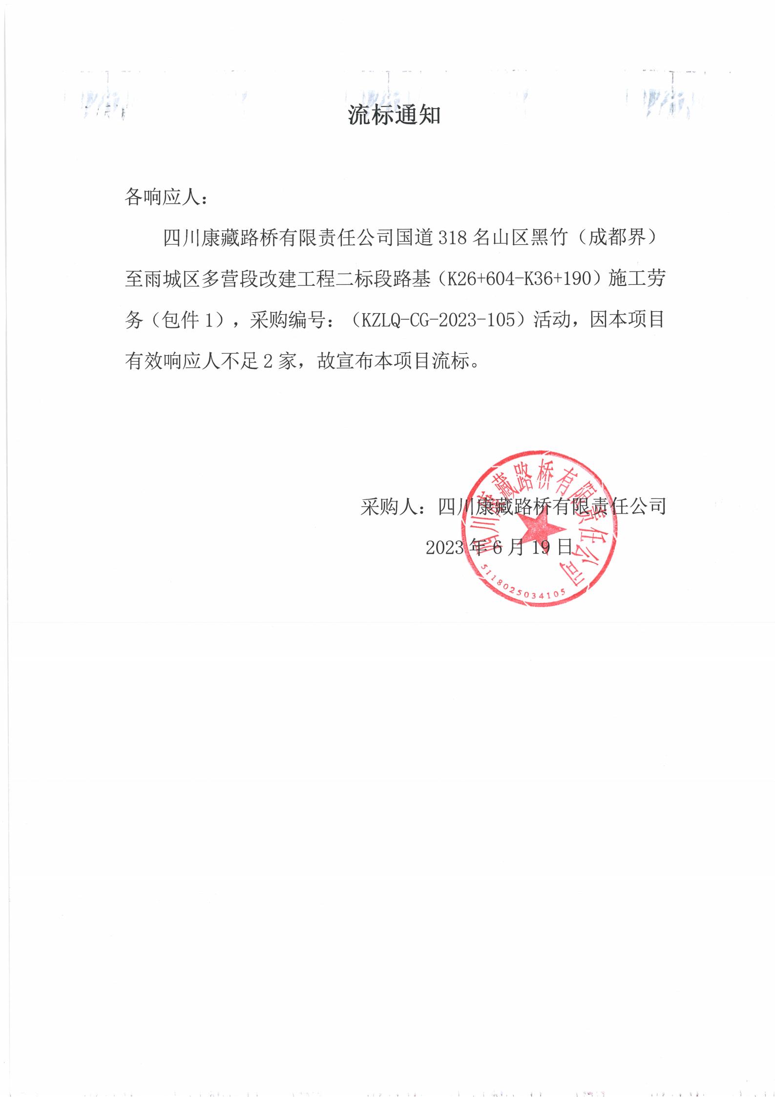 四川康藏路橋有限責(zé)任公司國道318名山區(qū)黑竹(成都界)至雨城區(qū)多營段改建工程二標(biāo)段路基(K26+604-K36+190)施工勞務(wù)采購(包件1)流標(biāo)通知