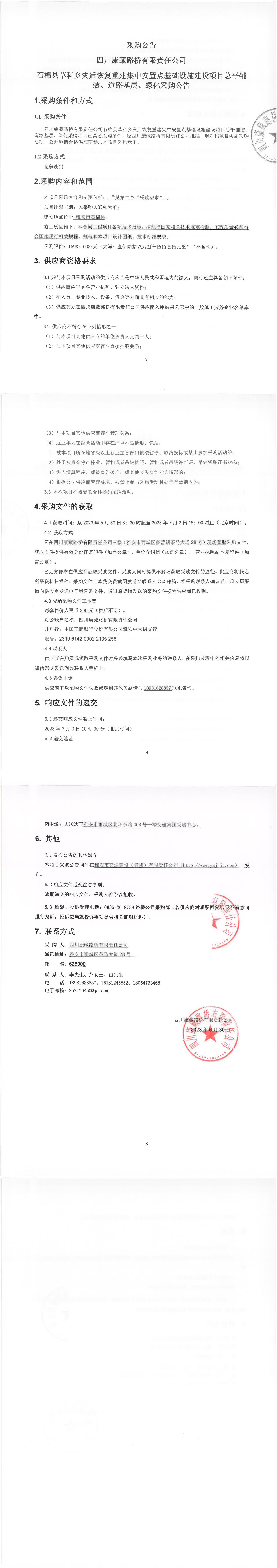 四川康藏路橋有限責(zé)任公司石棉縣草科鄉(xiāng)災(zāi)后恢復(fù)重建集中安置點(diǎn)基礎(chǔ)設(shè)施建設(shè)項(xiàng)目總平鋪裝、道路基層、綠化采購公告