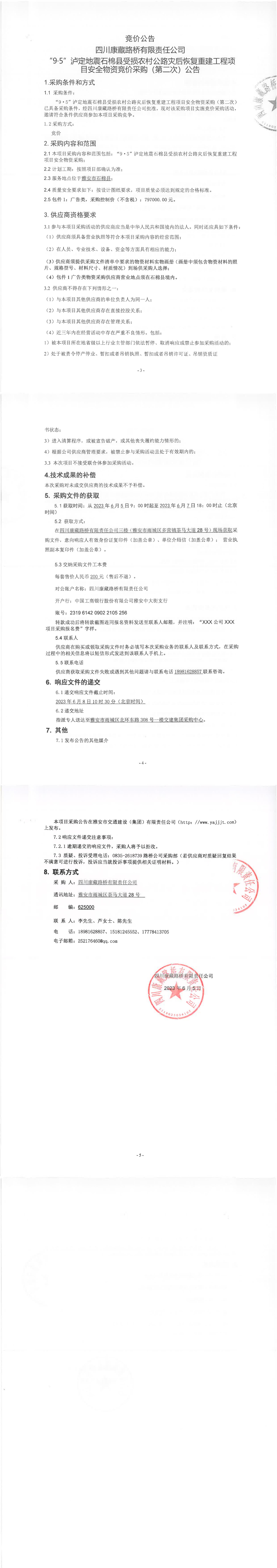 四川康藏路橋有限責(zé)任公司“9·5”瀘定地震石棉縣受損農(nóng)村公路災(zāi)后恢復(fù)重建工程項(xiàng)目安全物資競價(jià)采購(第二次)公告