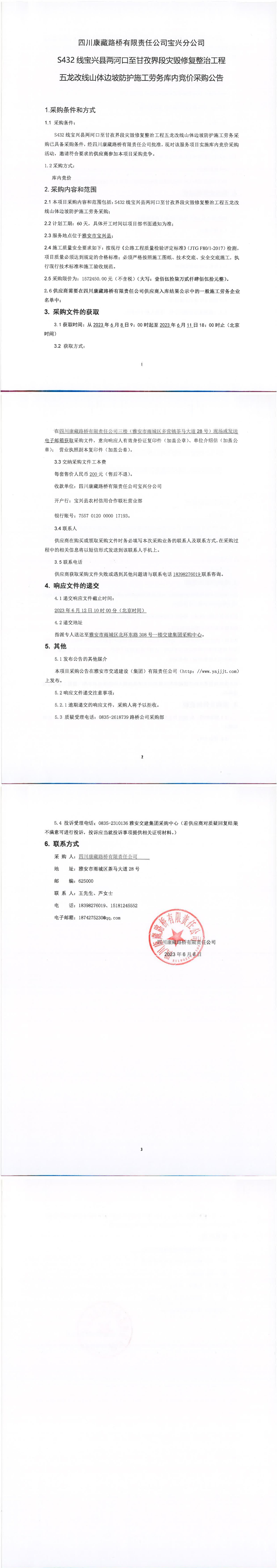 四川康藏路橋有限責(zé)任公司S432線(xiàn)寶興縣兩河口至甘孜界段災(zāi)毀修復(fù)整治工程五龍改線(xiàn)山體邊坡防護(hù)施工勞務(wù)庫(kù)內(nèi)競(jìng)價(jià)采購(gòu)公告