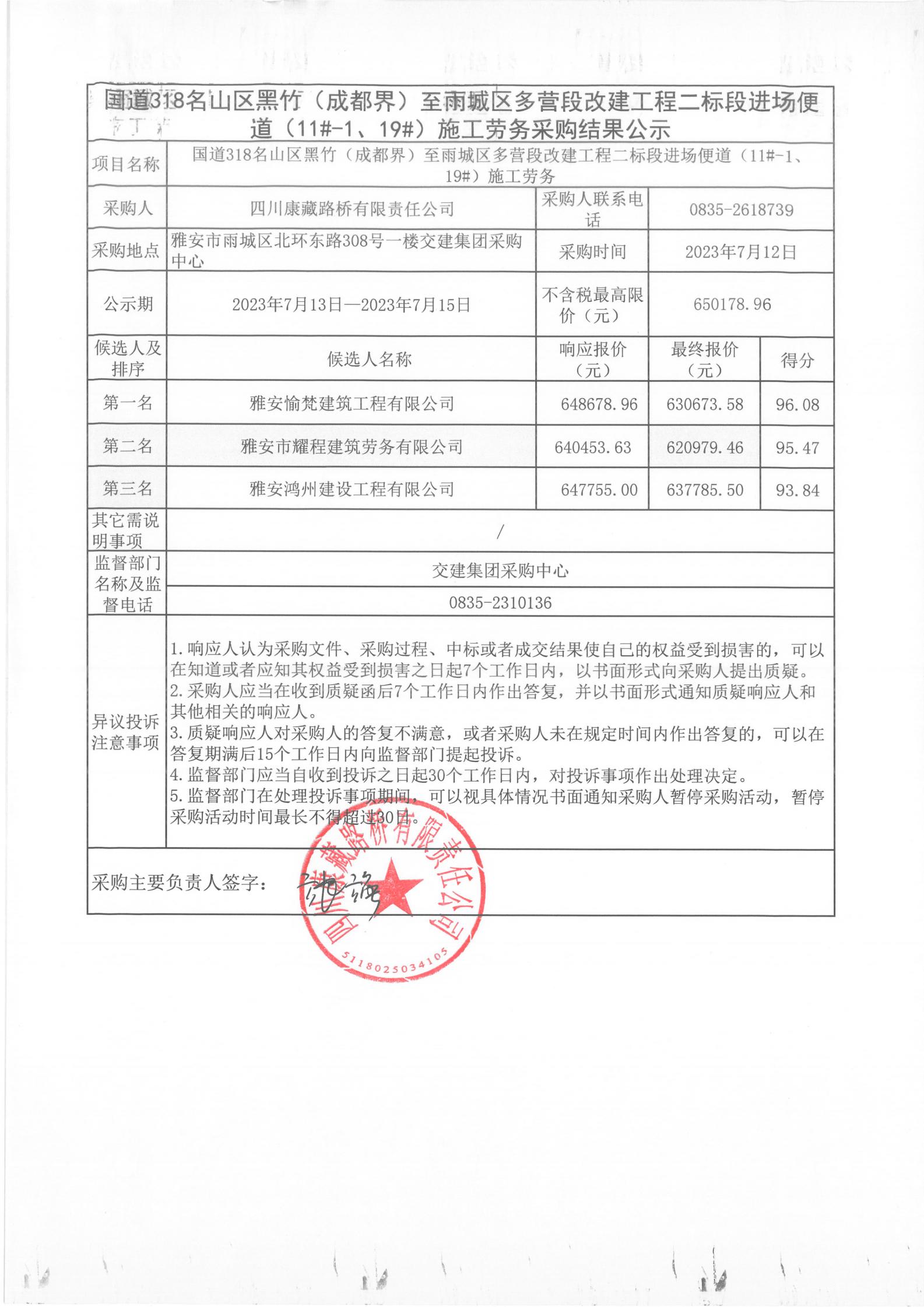 四川康藏路橋有限責(zé)任公司國道318名山區(qū)黑竹(成都界)至雨城區(qū)多營段改建工程二標(biāo)段進場便道(11#-1、19#)施工勞務(wù)采購結(jié)果公示
