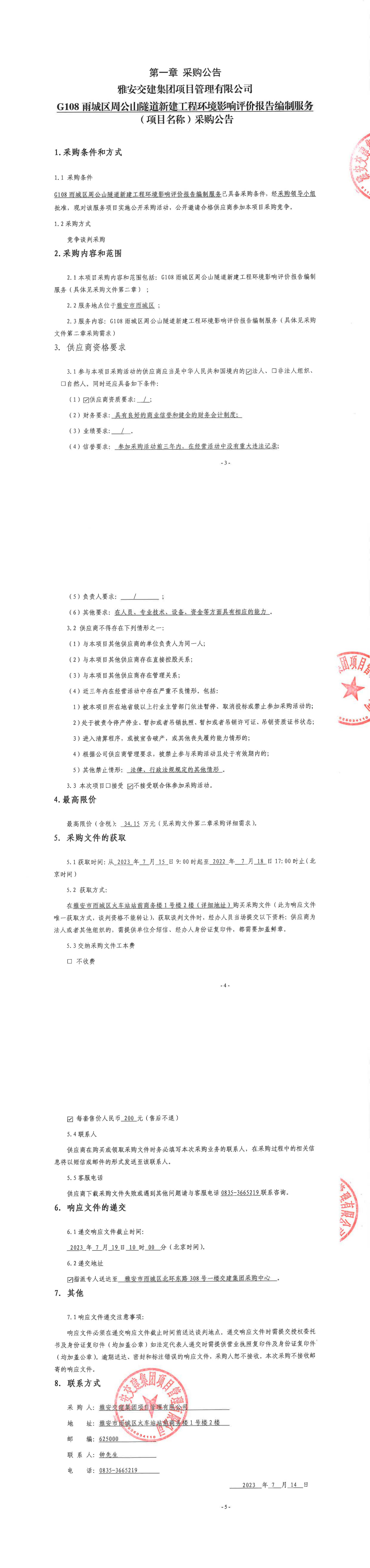 雅安交建集團項目管理有限公司G108雨城區(qū)周公山隧道新建工程環(huán)境影響評價報告編制服務(wù)(項目名稱)采購公告