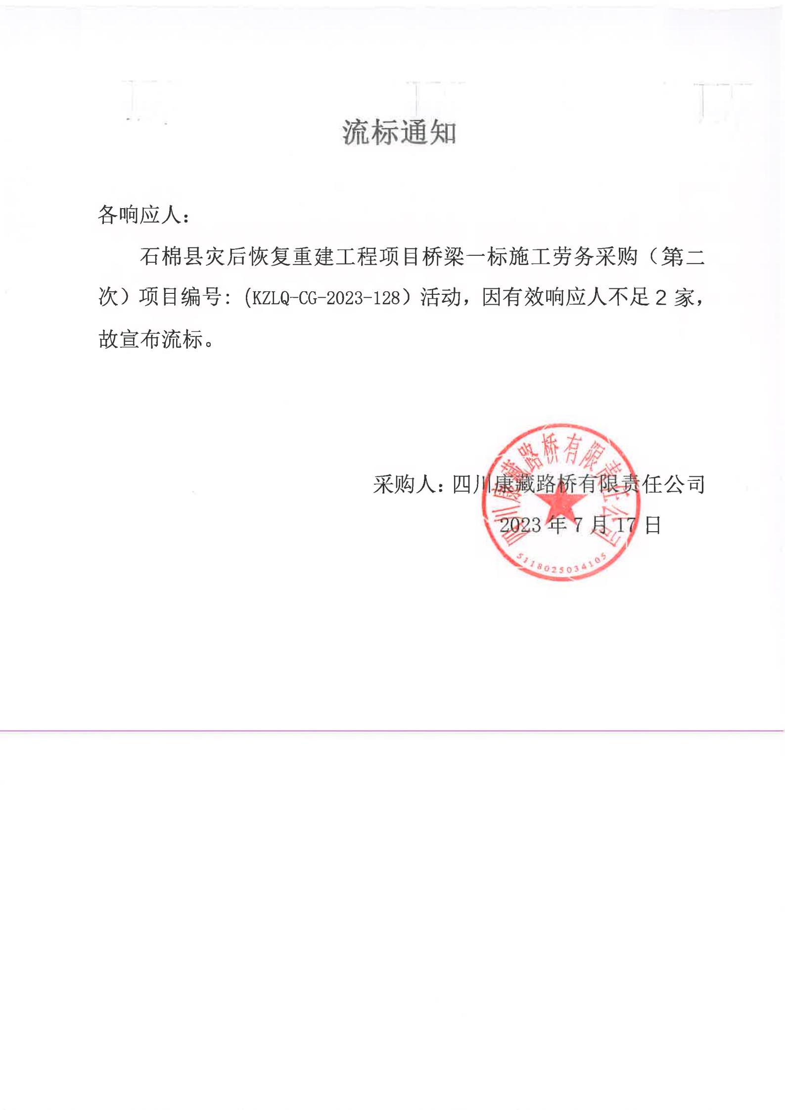 四川康藏路橋有限責(zé)任公司石棉縣災(zāi)后恢復(fù)重建工程項(xiàng)目橋梁一標(biāo)段施工勞務(wù)采購(第二次)流標(biāo)通知
