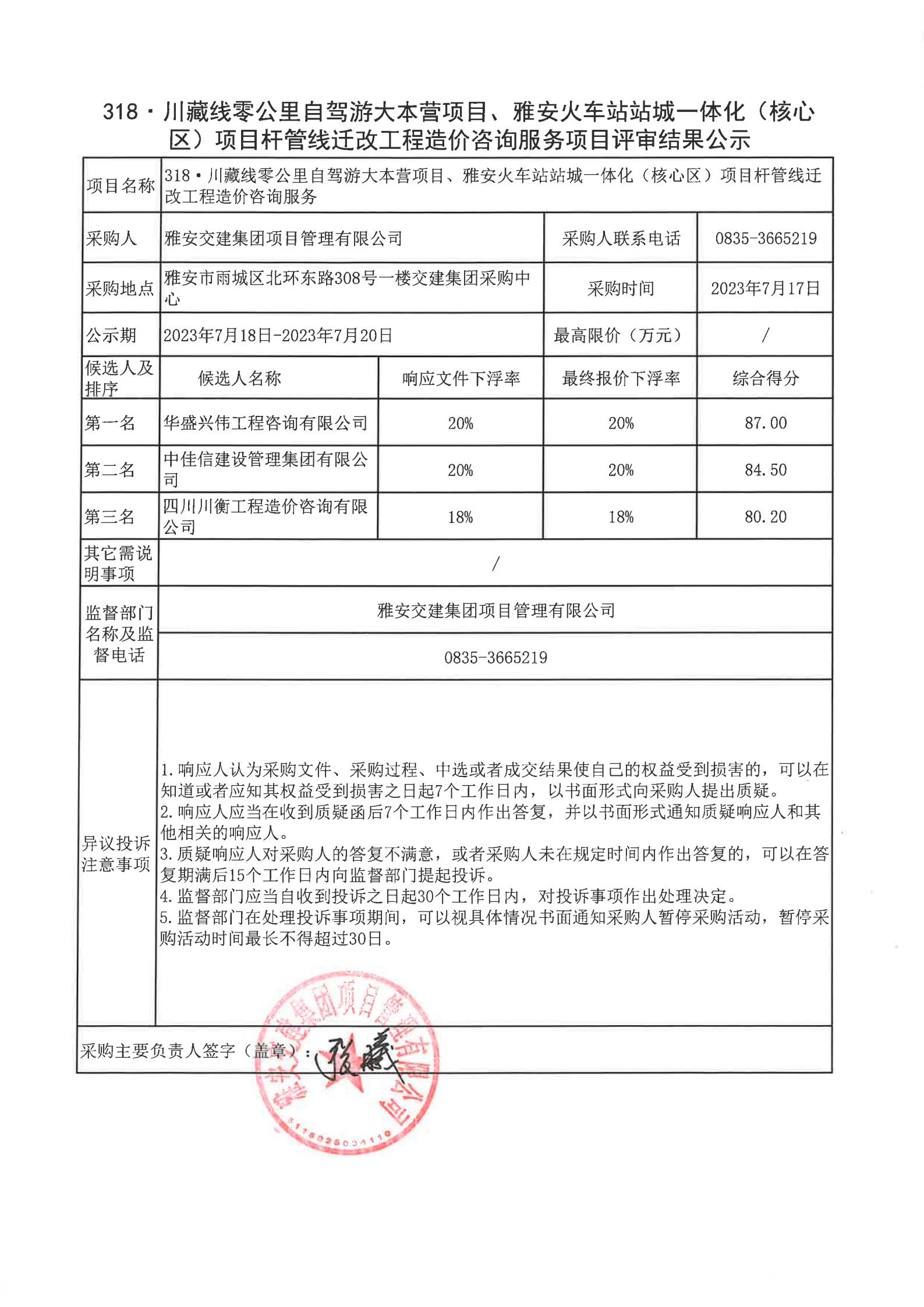雅安交建集團項目管理有限公司318·川藏公路零公里自駕游大本營項目、雅安火車站站城一體化(核心區(qū))項目桿管線遷改工程造價咨詢服務項目評審結果公示