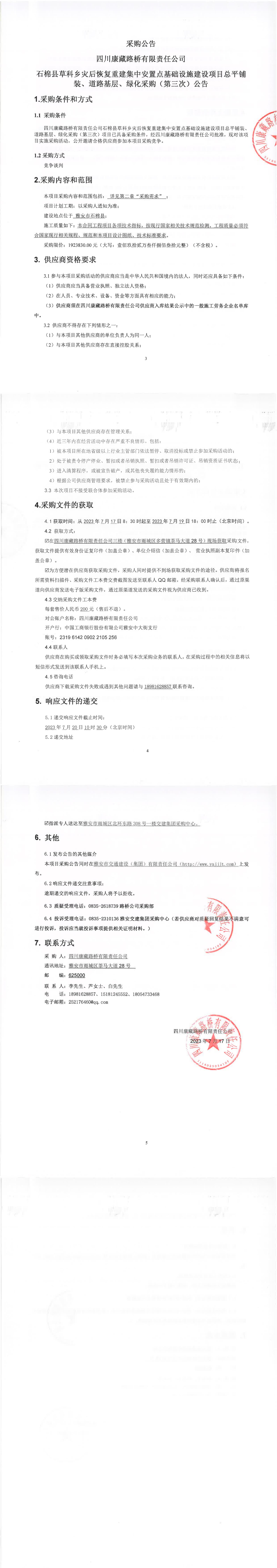 四川康藏路橋有限責(zé)任公司石棉縣草科鄉(xiāng)災(zāi)后恢復(fù)重建集中安置點(diǎn)基礎(chǔ)設(shè)施建設(shè)項目總平鋪裝、道路基層、綠化采購(第三次)公告