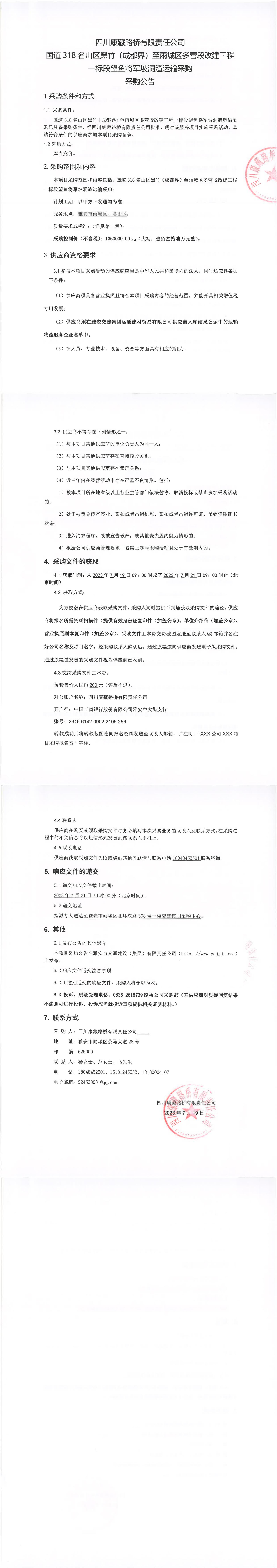 四川康藏路橋有限責(zé)任公司國道318名山區(qū)黑竹(成都界)至雨城區(qū)多營段改建工程一標(biāo)段望魚將軍坡洞渣運輸采購公告