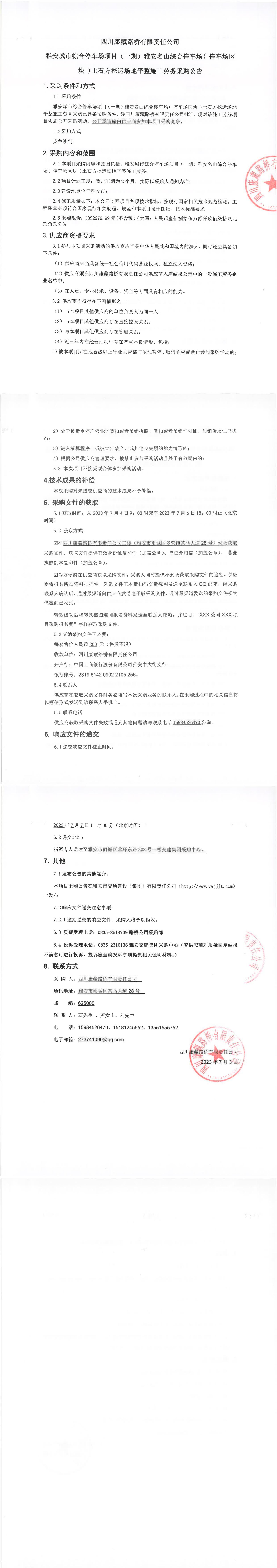 四川康藏路橋有限責任公司雅安城市綜合停車場項目(一期)雅安名山綜合停車場(停車場區(qū)塊)土石方挖運場地平整施工勞務采購公告