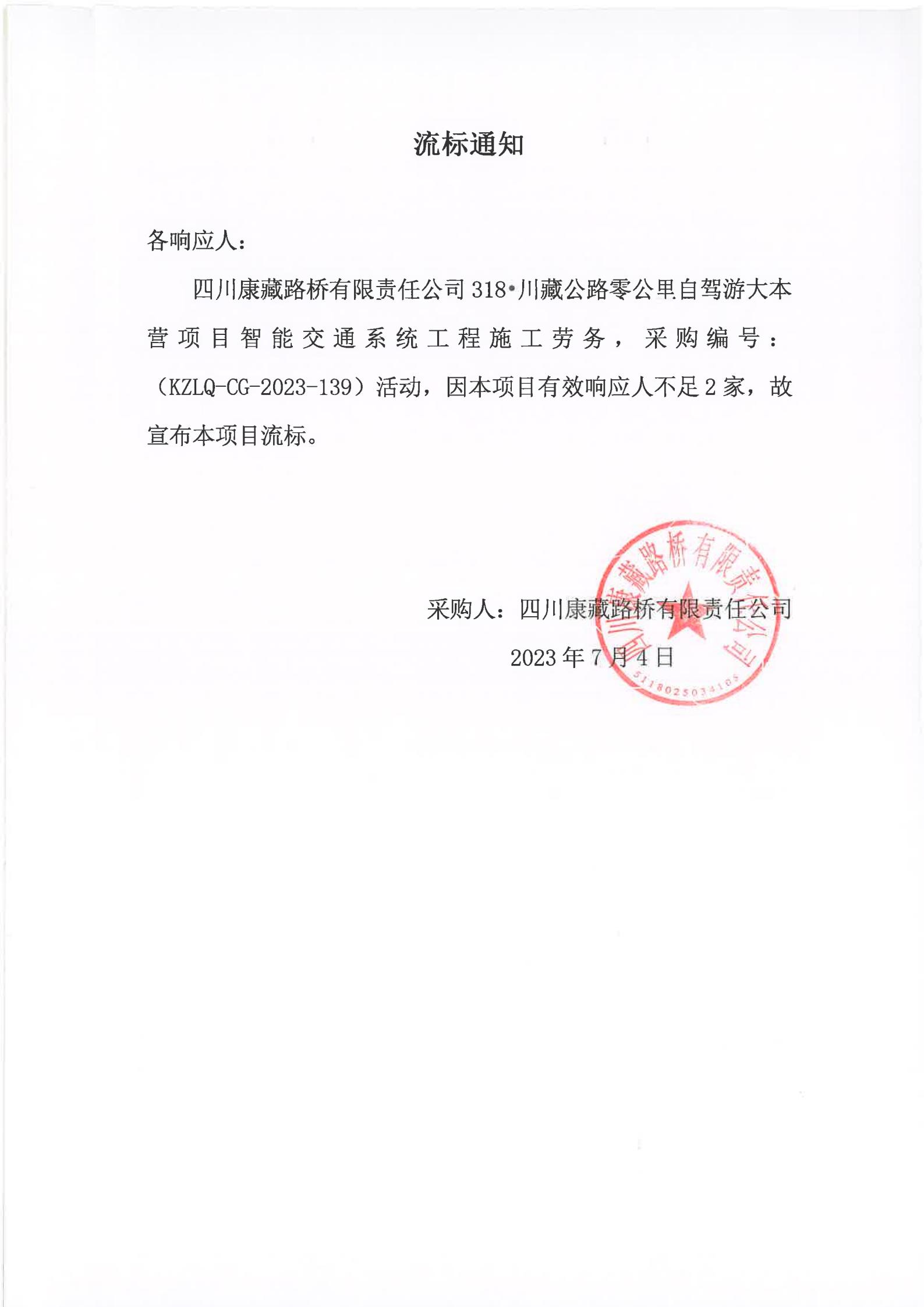 四川康藏路橋有限責(zé)任公司318·川藏公路零公里自駕游大本營項(xiàng)目智能交通系統(tǒng)工程施工勞務(wù)流標(biāo)通知