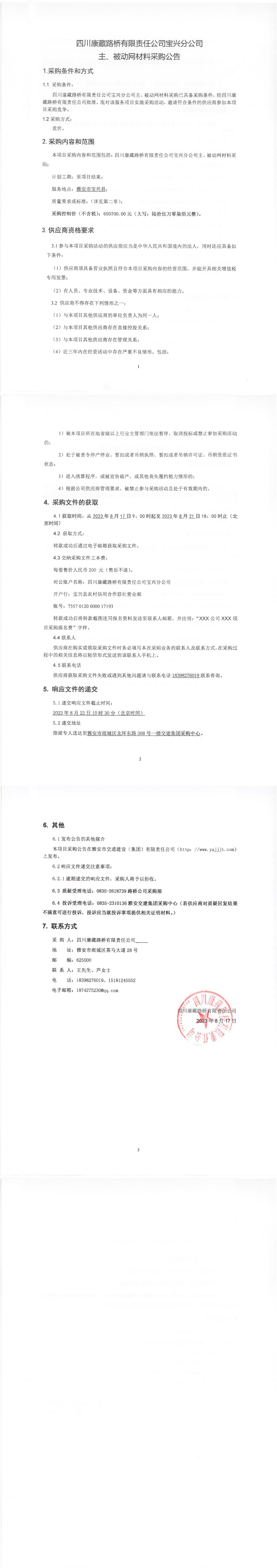 四川康藏路橋有限責(zé)任公司寶興分公司主、被動網(wǎng)材料采購公告