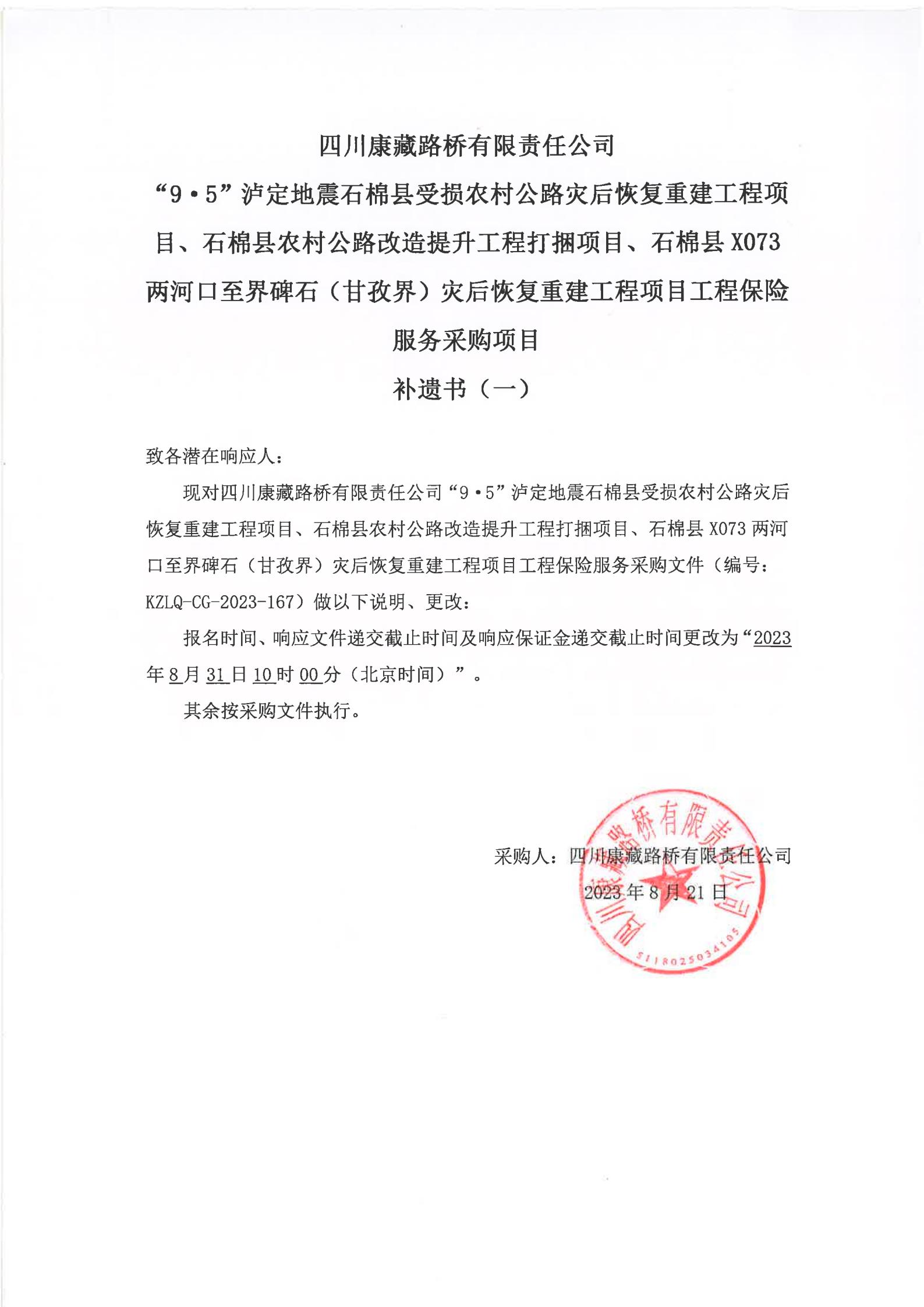 四川康藏路橋有限責(zé)任公司“9·5”瀘定地震石棉縣受損農(nóng)村公路災(zāi)后恢復(fù)重建工程項(xiàng)目、石棉縣農(nóng)村公路改造提升工程打捆項(xiàng)目、石棉縣X073兩河口至界碑石(甘孜界)災(zāi)后恢復(fù)重建工程項(xiàng)目工程保險服務(wù)采購項(xiàng)目補(bǔ)遺書(一)