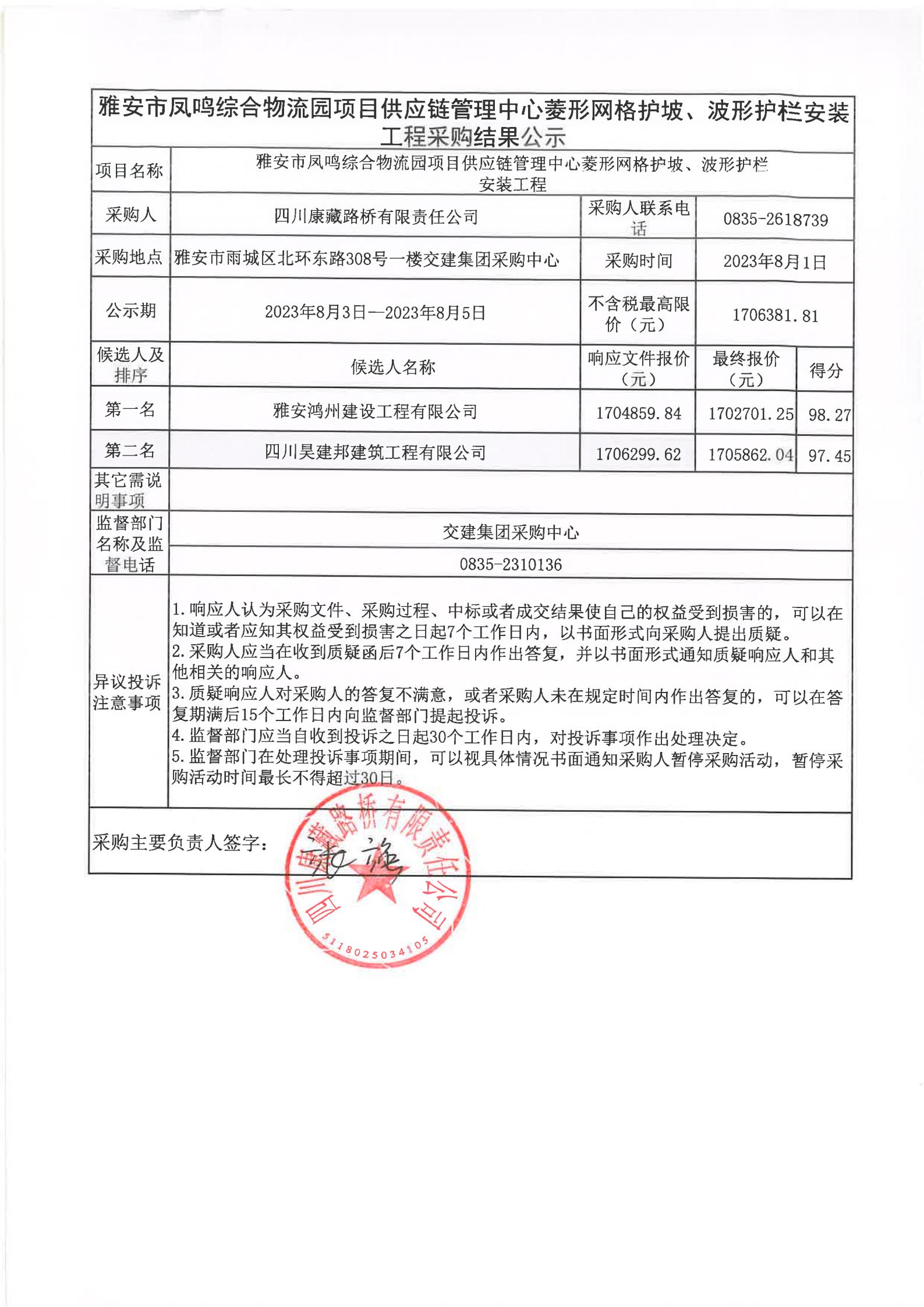 四川康藏路橋有限責(zé)任公司雅安市鳳鳴綜合物流園項(xiàng)目供應(yīng)鏈管理中心菱形網(wǎng)格護(hù)坡、波形護(hù)欄安裝工程采購結(jié)果公示