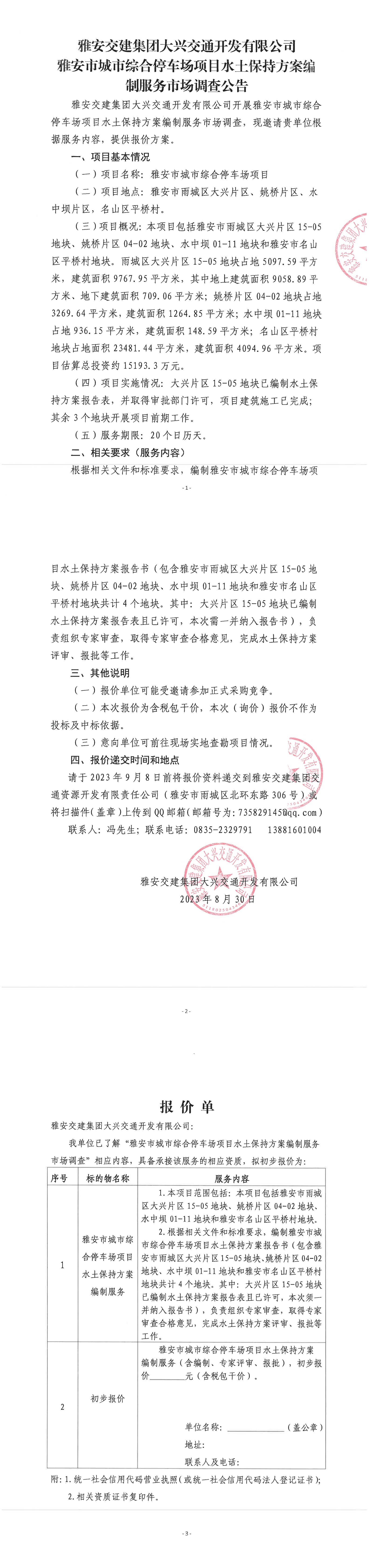 雅安交建集團(tuán)大興交通開(kāi)發(fā)有限公司雅安市城市綜合停車場(chǎng)項(xiàng)目水土保持方案編制服務(wù)市場(chǎng)調(diào)查公告
